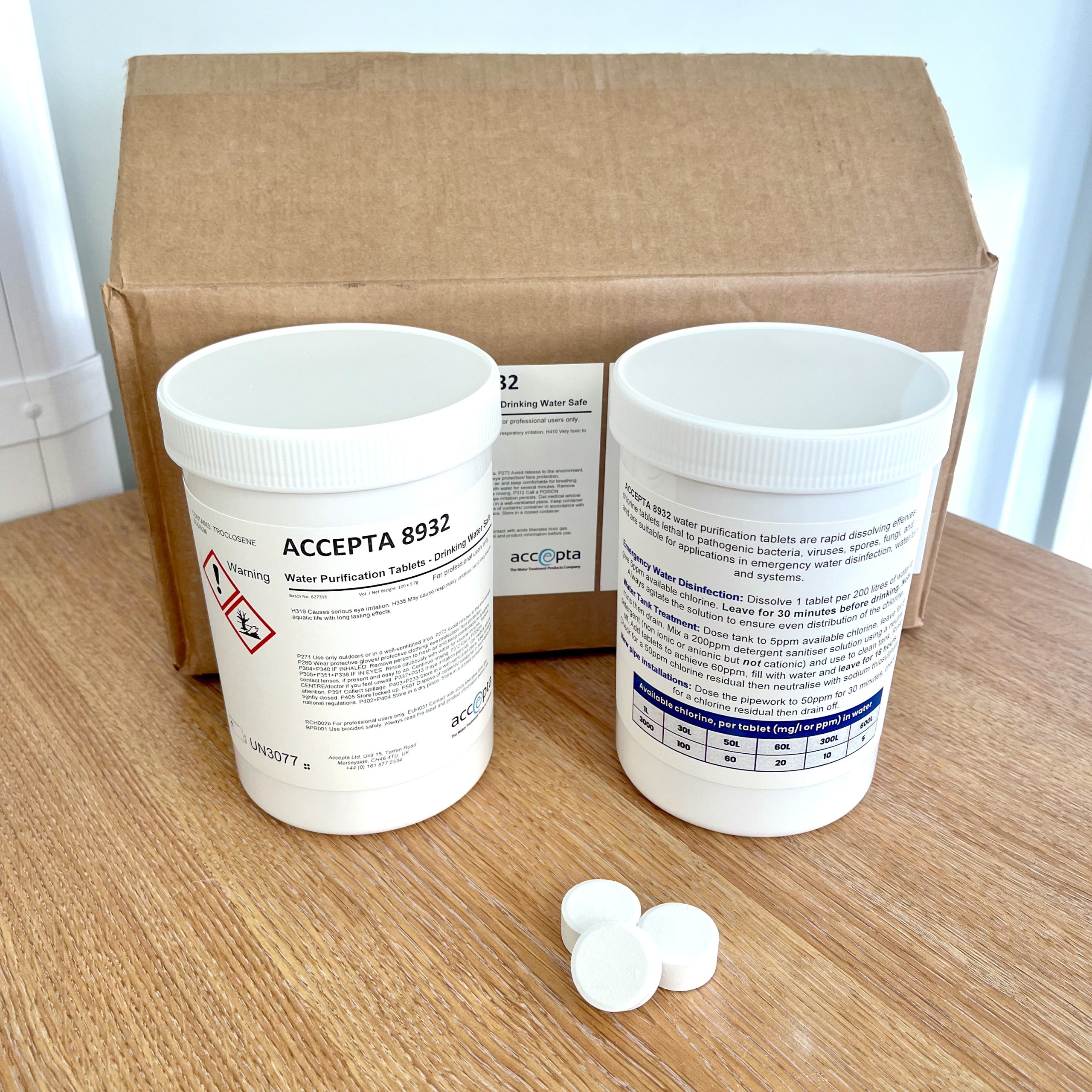 Accepta 8932 are high-performance drinking water-safe water purification tablets based on chlorine that have been developed to offer a fast dissolving, convenient, safer and more accurate disinfection alternative to liquid bleach.